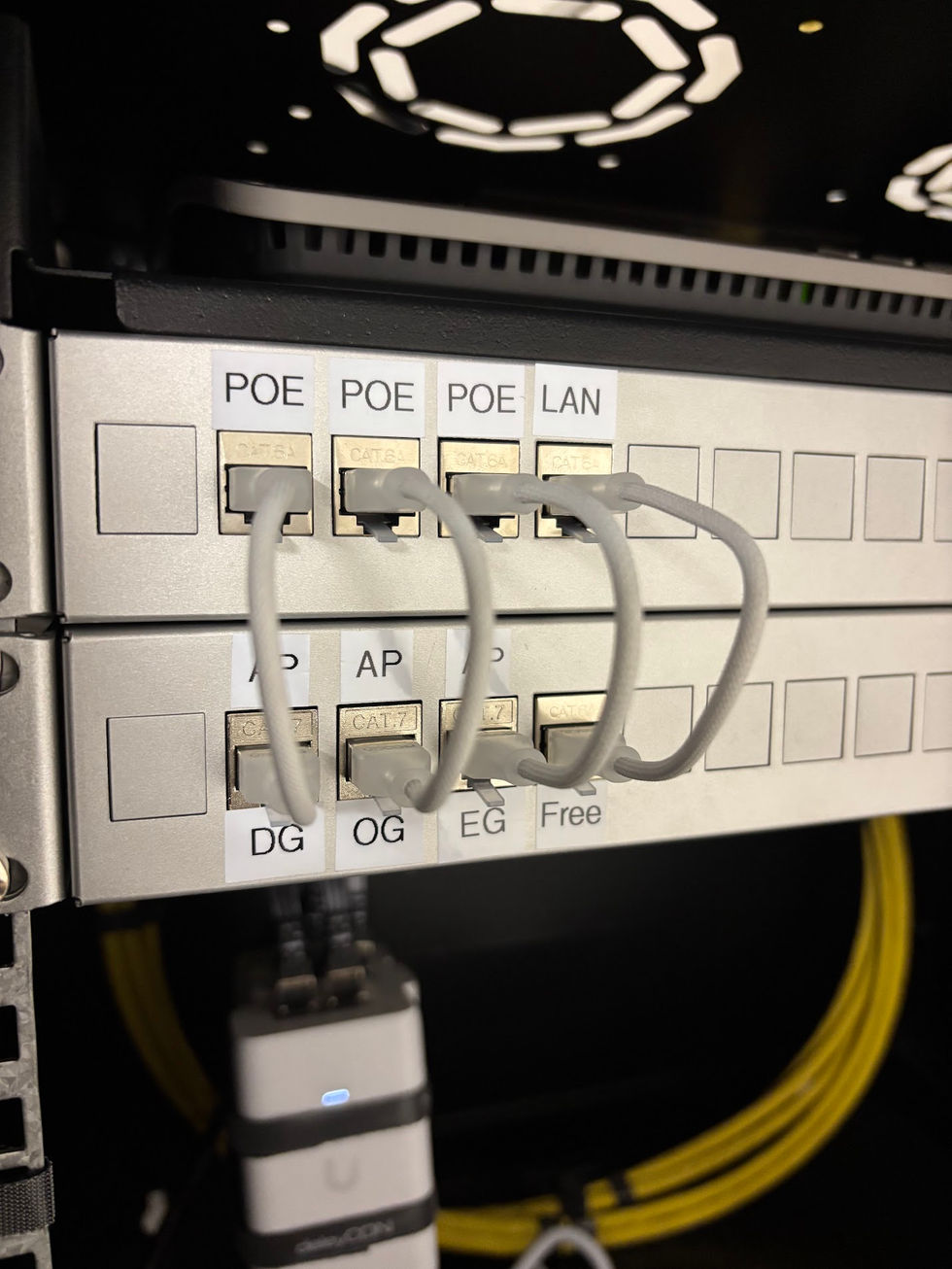 3 Unifi in-Wall 6 Access Points mit minimalem Netzwerkschrank im Keller. Die Projektleitung umfasste die Planung und Kooperation mit der Elektrik-Fachfirma sowie die Materialbestellung. Vorab erfolgte eine Heatmap Simulation auf Basis der Flurpläne für die optimale Positionierung der Access Points. Die Access Points wurden vorkonfiguriert ausgeliefert.